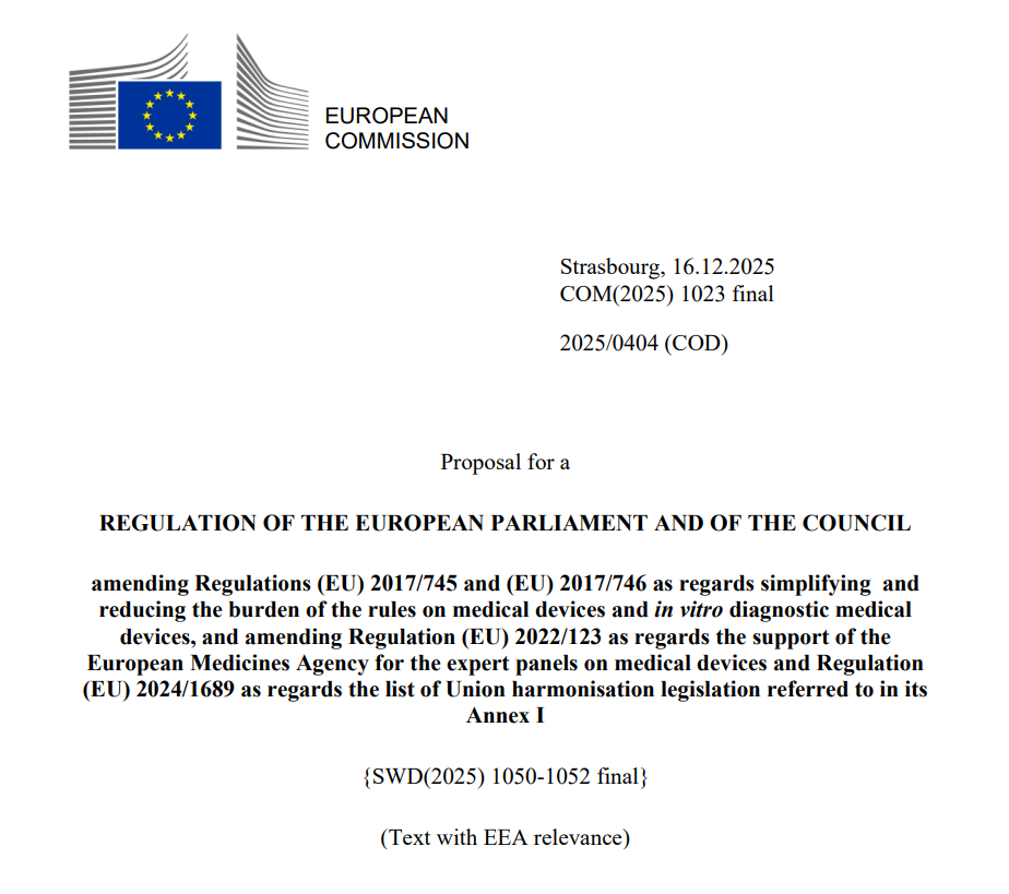 欧盟委员会于 2025 年 12 月 16 日,欧盟委员会正式提交了“关于简化修订《欧盟医疗器械法规(MDR,EU 2017/745)》和《欧盟体外诊断医疗器械法规(IVDR,EU 2017/746)》的提案”。其核心目标是简化监管法规、减轻企业合规负担、提升认证效率与可预测性,同时维持高水平的患者安全与公共健康保护。