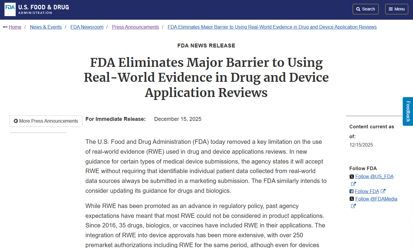 美国食品药品监督管理局(FDA)于2025年12月15日发布重要政策调整,取消了在药品和医疗器械审批中使用真实世界证据(RWE)的一项关键限制。