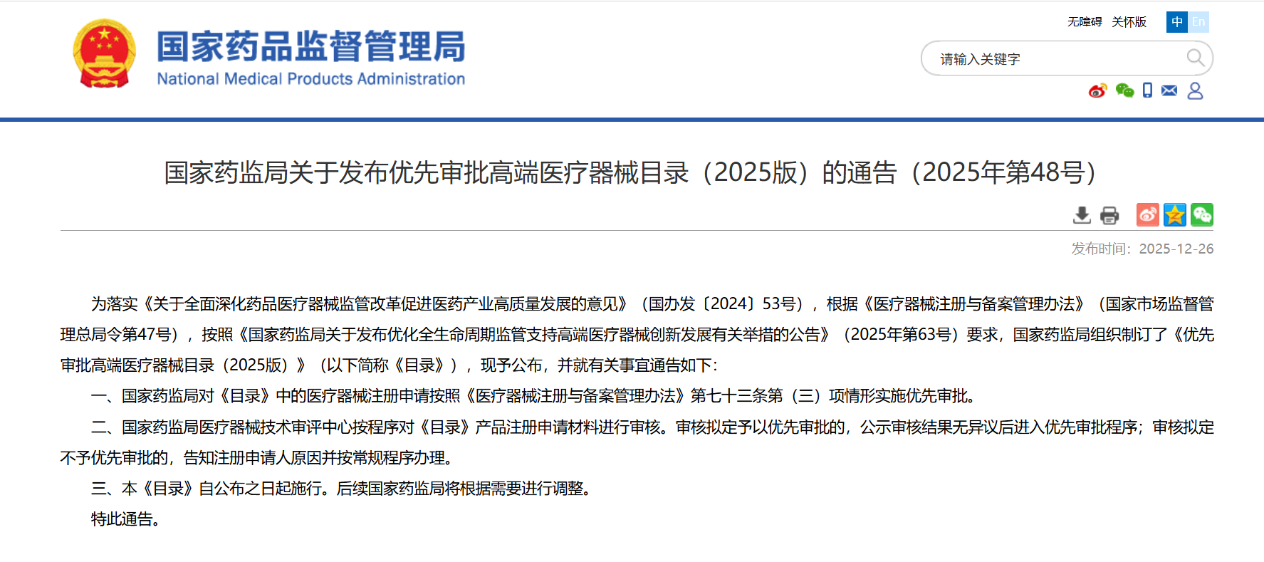 国家药监局关于发布优先审批高端医疗器械目录(2025版)的通告(2025年第48号)