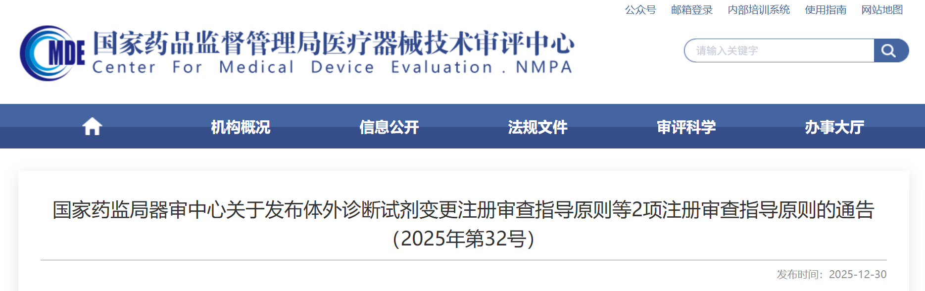 国家药监局器审中心关于发布体外诊断试剂变更注册审查指导原则等2项注册审查指导原则的通告(2025年第32号)