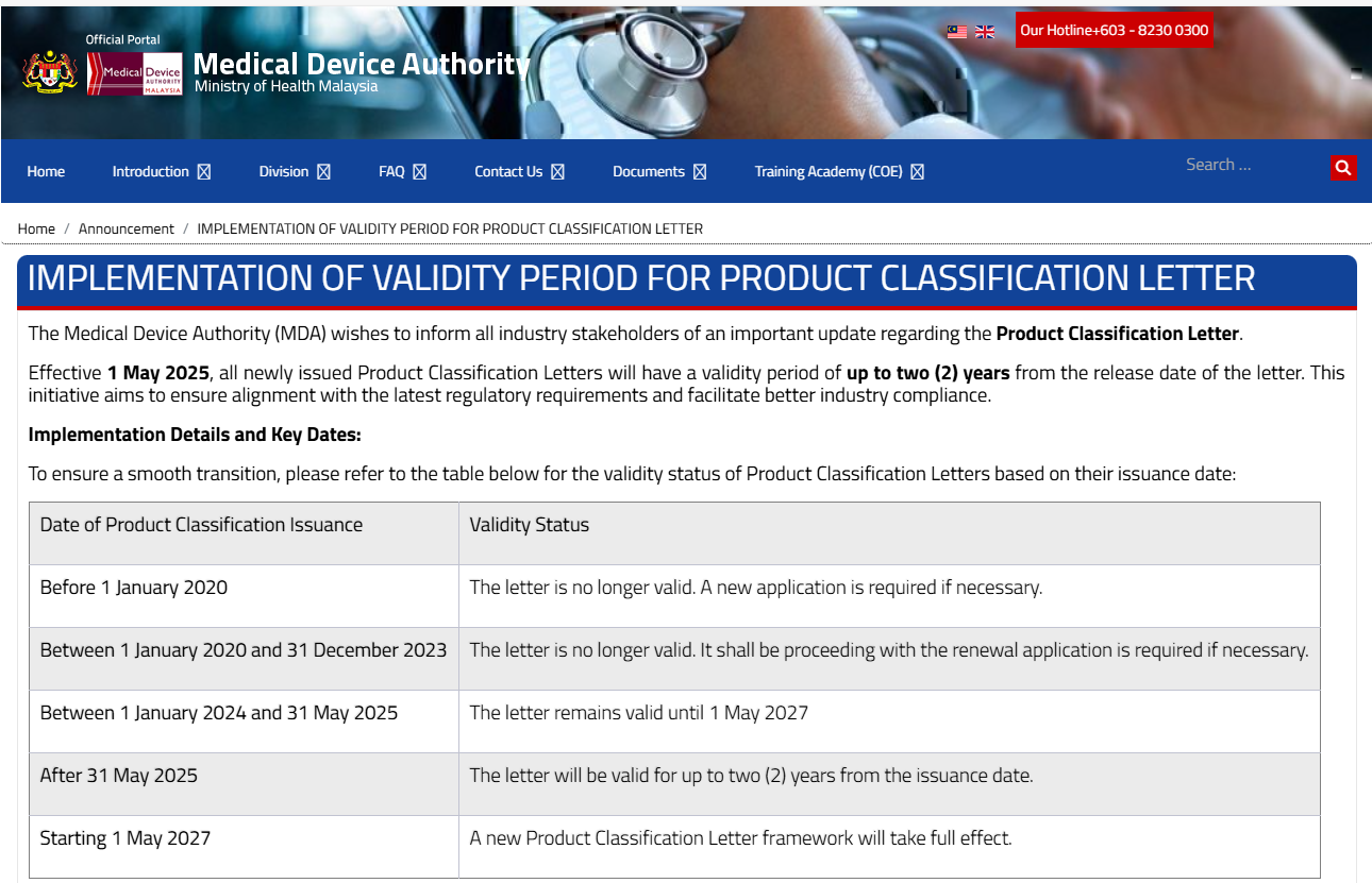 【马来西亚】MDA进一步明确医疗器械产品分类函有效期