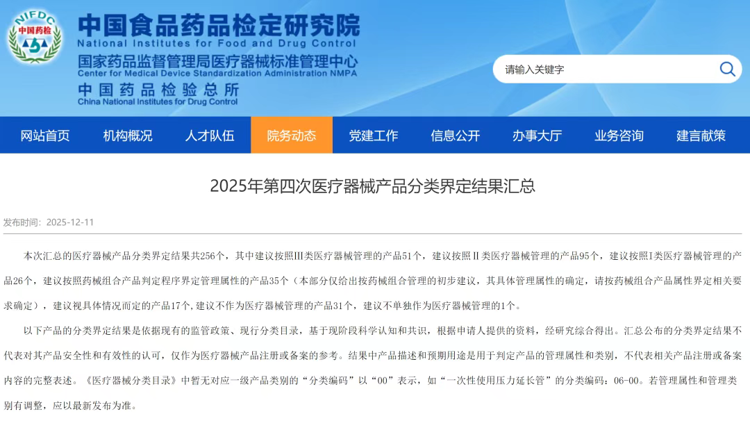 NMPA标管中心发布《2025年第四次医疗器械分类界定结果汇总》