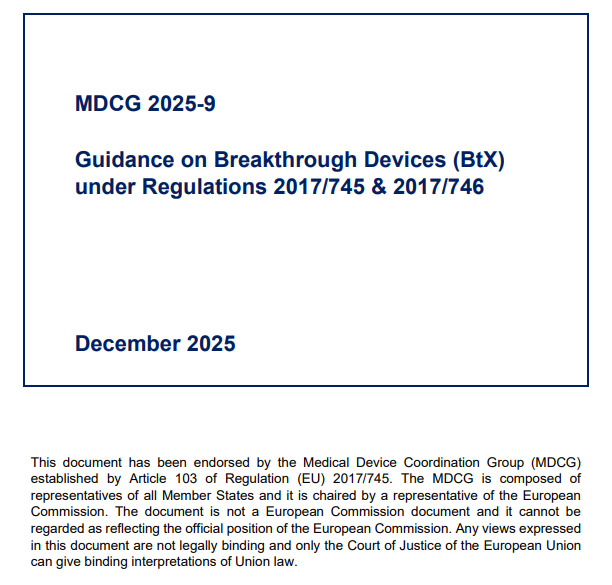 2025年12月,欧盟发布MDCG 2025-9 突破性医疗器械(Breakthrough Devices, BtX)指南。该指南在MDR和IVDR既有框架内,通过解释性与协调性规则,为具有高度创新性且面向严重疾病或未满足医疗需求的医疗器械,提供一条更具可预期性和比例性的监管路径。