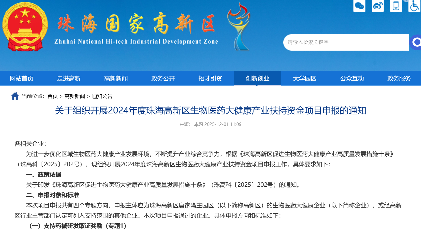 关于印发《珠海高新区促进生物医药大健康产业高质量发展措施十条》(珠高科〔2025〕202号)的通知。